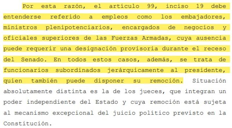 "La Constitución establece un procedimiento especial y reforzado para designar a los jueces de la Corte Suprema, que exige acuerdo del Senado por dos tercios de los miembros presentes en sesión pública. En cambio, Milei usó una norma excepcional que permite cubrir provisoriamente otros cargos, como embajadores o jefes militares, solo cuando la vacante ocurre durante el receso legislativo", afirmó.