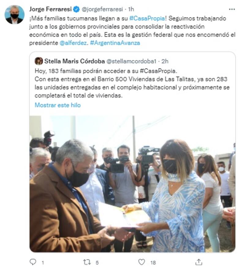 En esta ocasión el titular de la cartera de vivienda, Jorge Ferraresi, entregó 183 créditos adjudicados en el Barrio 500 Viviendas de Las Talitas, Tucumán, que se suman a los 100 que ya se habían entregado con anterioridad.