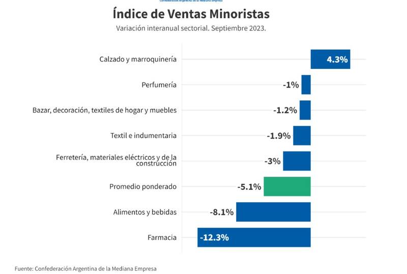 Dos de los sectores más perjudicados durante el mes de septiembre fueron Alimentos y Bebidas, con una contracción del 8,1% anual, y Farmacias, que experimentaron una disminución del 12,3% en sus ventas anuales.