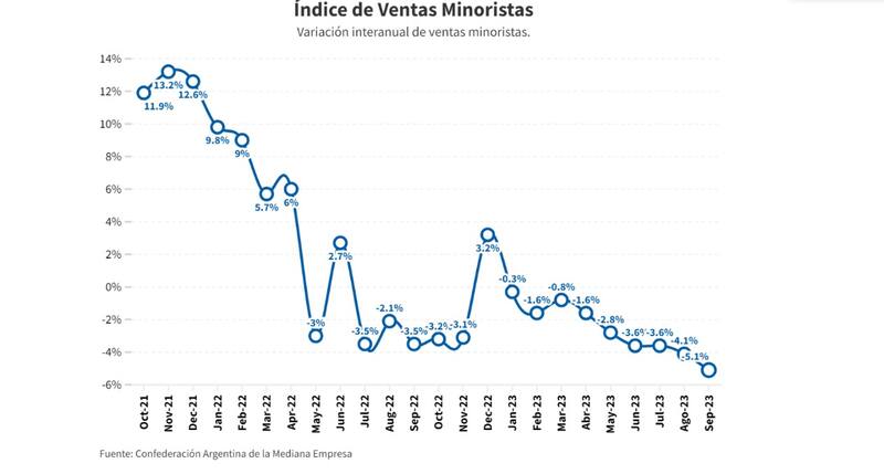 Las ventas minoristas de pequeñas y medianas empresas (pymes) experimentaron una caída del 5,1% en términos anuales durante el mes de septiembre. Este retroceso marca el noveno mes consecutivo de disminución en el consumo en comparación con el mismo período del año anterior. En los primeros nueve meses del año, las ventas minoristas pyme acumulan una baja del 2,6% en relación con el mismo período de 2022. Además, en una comparación mensual, las ventas cayeron un 1,1% con respecto a agosto.