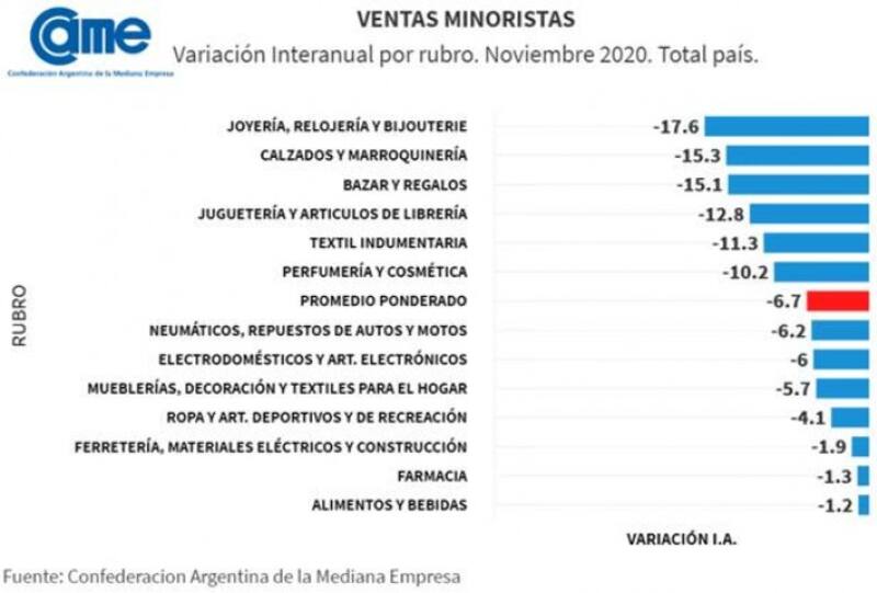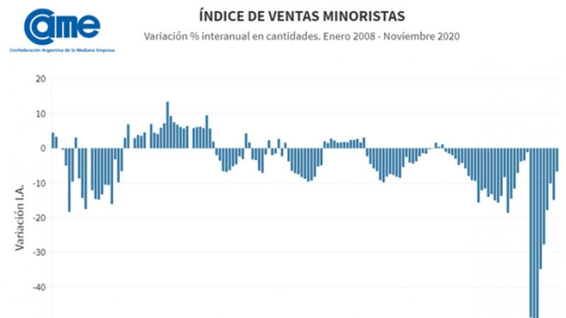 Las ventas minoristas cayeron un 6,7% en noviembre y el acumulado en lo que va de 2020 es del 24,3%, de acuerdo al último informe de la Confederación Argentina de la Mediana Empresa (Came). El paso del aislamiento al distanciamiento y la estabilización de la brecha cambiaria, en torno al 80%, contribuyeron a desacelerar la caída.