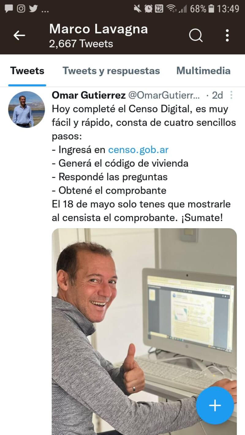 Los gobernadores son aliados de Lavagna para el censo. Lo prueba el mensaje del neuquino Omar Gutiérrez quien en un rol más parecido al de un influercer compartió un simpático mensaje en redes sociales. "Completé el Censo Digital, es muy fácil y rápido", dijo y acompañó el texto con una foto frente a su computadora con el pulgar en alto y los cuatro pasos para realizar el trámite.