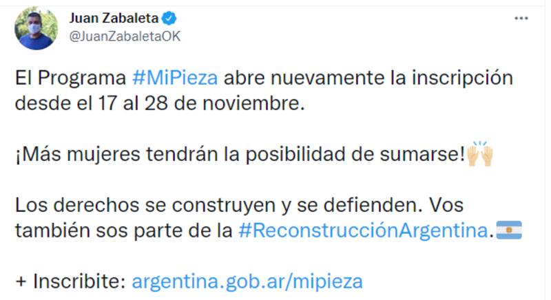 "¡El programa #MiPieza vino para quedarse! Estamos pensando en las mujeres de los barrios populares", destacó el titular de la cartera nacional, Juan Zabaleta, en redes sociales.