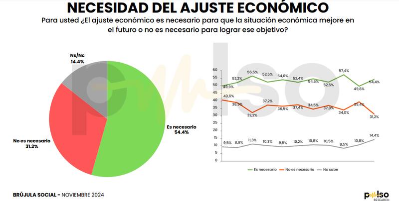 Otro dato que respalda la proyección electoral libertaria es la pregunta acerca de la necesidad del ajuste económico. Ante el interrogante, para usted, ¿el ajuste económico es necesario para que la situación económica mejore en el futuro o no es necesario para lograr ese objetivo?, el 54,4% dice que es necesario, mientras que un 31,2% dice que no es necesario y un 14,4% no sabe y no contesta.