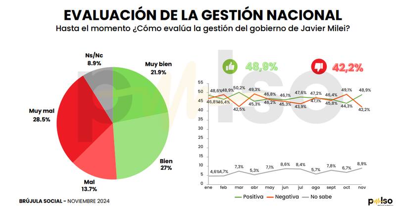 Mientras que quienes consideran que la gestión nacional es "muy mala" son un 28,5%, que se suman al 13,7% de los que consideran que la gestión "es mala", lo que sumado da casi 39%.