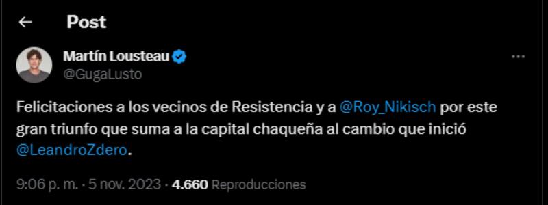 Tras conocer los resultados, referentes de radicalismo felicitaron a Nikisch por ser elegido como el nuevo intendente de Resistencia, entre ellos Martín Lousteau.