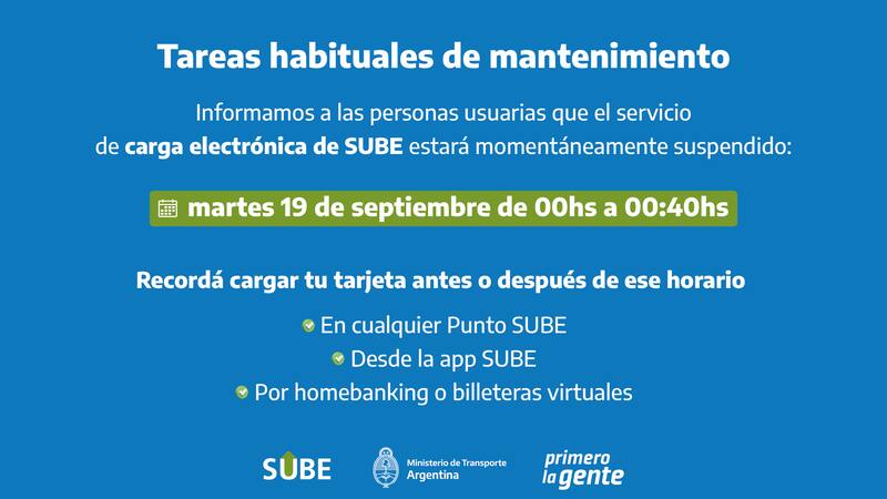 Desde SUBE comunicaron se trata de un mantenimiento habitual de los servicios y que se realizará desde las 00.00 hasta las 00.40. En esa franja horaria estará deshabilitada la opción de carga electrónica de la tarjeta.