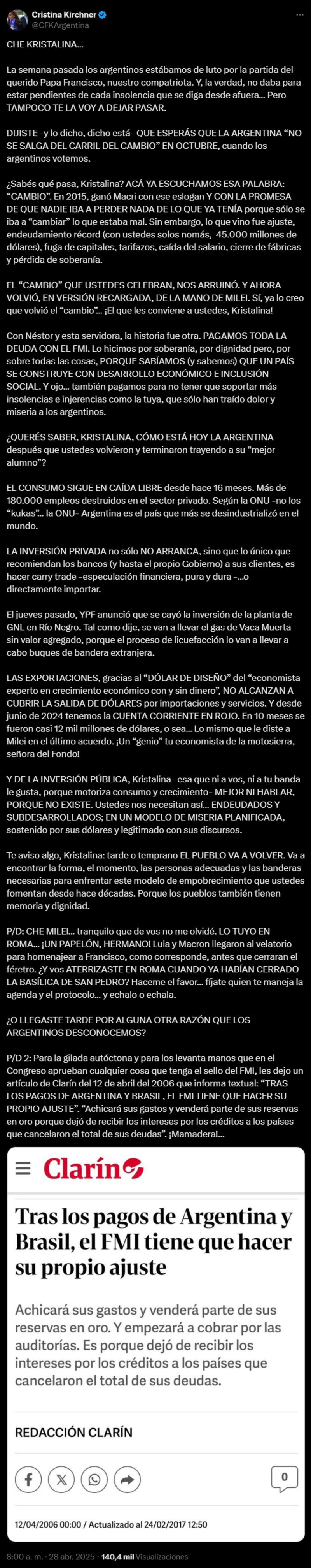 "Che Kristalina...", comienza el texto que difundió la líder del Partido Justicialista (PJ), apelando a su habitual estrategia discursiva. "¿Sabés qué pasa, Kristalina? Acá ya escuchamos esa palabra: 'cambio'. En 2015, ganó (Mauricio) Macri con ese eslogan y con la promesa de que nadie iba a perder nada de lo que ya tenía porque solo se iba a 'cambiar' lo que estaba mal", señaló en su cuenta de X.