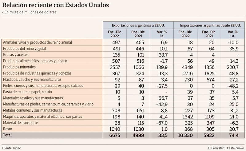 Comparativamente, Estados Unidos quedó muy por detrás en la relación comercial con Argentina. En el último año hubo u$s 6.600 millones de exportaciones argentinas al mercado norteamericano mientras que se importó de Estados Unidos por un global de u$s 10.000 millones.
