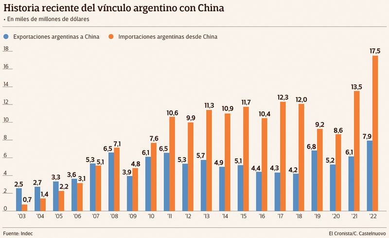 Según la evolución del comercio de China con Argentina se ve claramente que en 2003 la Argentina exportaba a China u$s 2.576 millones e importaba por u$s 743 millones. Hacia el 2011, que es cuando Cristina Kirchner sella la "alianza estratégica integral" con el gobierno de Xi Jinping, las importaciones crecieron exponencialmente a u$s 10.600 millones mientras que las exportaciones argentinas eran del orden de u$s 6.500 millones.