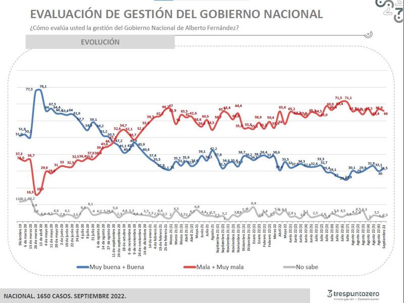 Finalmente, a modo de contexto, la encuesta pidió también la evaluación sobre la gestión del gobierno nacional. Respecto a la anterior medición hay un leve repunte, a pesar de que los números siguen siendo negativos. El 66% la califica como "mala" o "muy mala", mientras que el 31% cree que es "buena" o "muy buena".