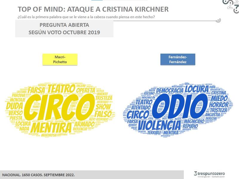 En primer lugar se realizó una consulta abierta. Ante la pregunta "¿cuál es la primera palabra que se le viene a la cabeza cuando piensa en este hecho?", en alusión al ataque, existe un evidente desfase según la orientación política. Para quienes votaron en 2019 la fórmula Fernández-Fernández, lo más mencionado fue "odio", "violencia", "circo", "locura" y "miedo".
