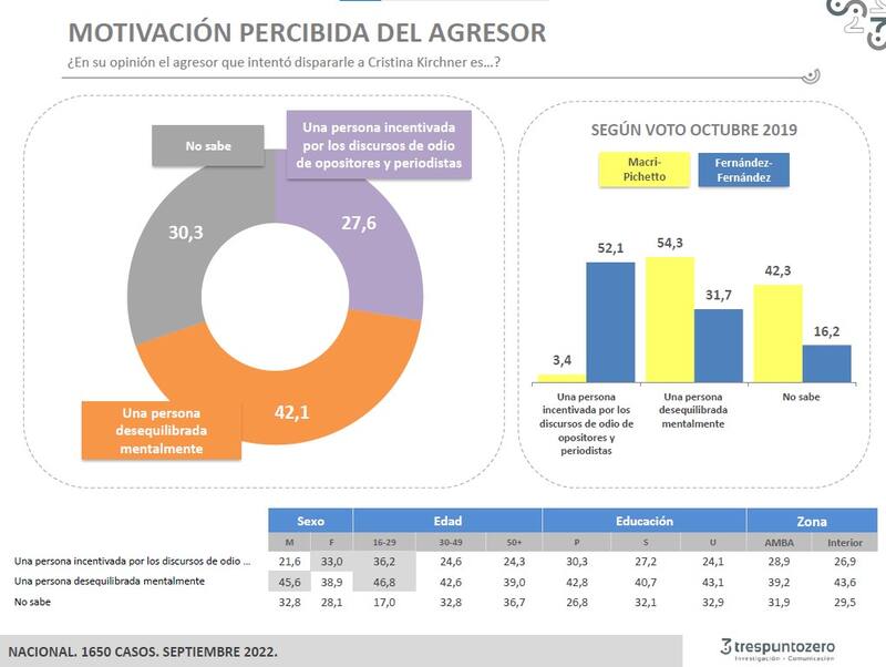 Cuando se exploró sobre las motivaciones del agresor también se evidenció la grieta. El 28% del total respondió que fue una persona "incentivada por los discursos de odio de opositores y periodistas". Entre ellos, fueron proporcionalmente más los votantes del oficialismo, las mujeres y las personas de entre 16 y 29 años.