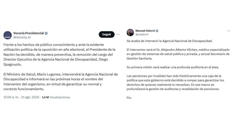 Posteriormente, durante la tarde del jueves, el vocero presidencial Manuel Adorni informó que se acababa de intervenir ANDIS. "El interventor será el Dr. Alejandro Alberto Vilches, médico especializado en gestión de sistemas de salud pública y privada, y actual Secretario de Gestión Sanitaria", contó acerca del funcionario a cargo.