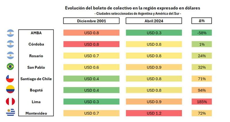 De hecho, los empresarios difundieron un informe en el que muestran que el boleto de colectivo en dólares es el más bajo de toda la región: 0,3 dólares. El más caro es en Montevideo, de 1,2 dólares. Además, esto implica que el boleto registró una baja del 58%, dado que en diciembre del 2001 costaba 0,8 dólares.