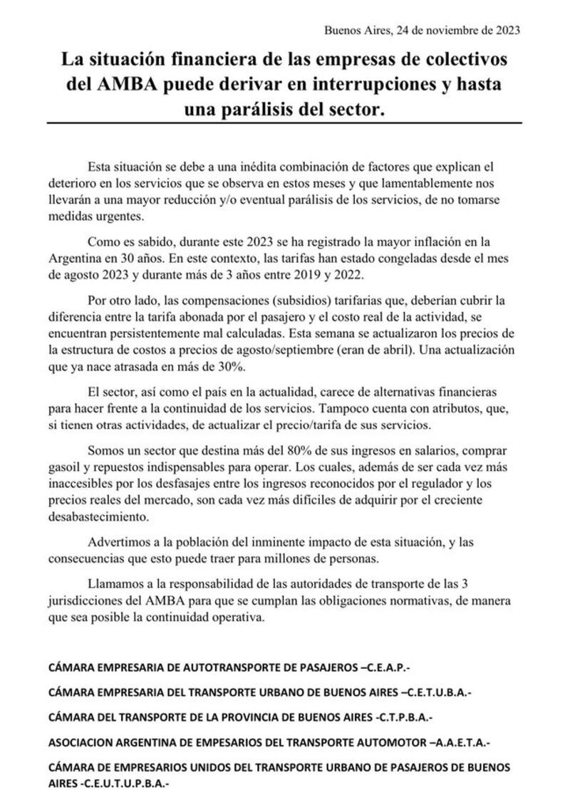 Las empresas de colectivos que circulan en el Área Metropolitana de Buenos Aires (AMBA) advierten por la dificultad para afrontar el pago del medio aguinaldo de diciembre, escenario que de no encontrar solución podría desembocar en un nuevo paro.