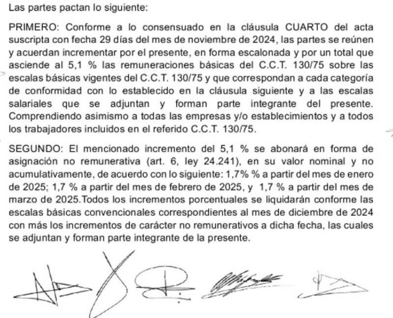 La suma acordada, que elevará los salarios de todos los empleados agrupados bajo el CCT 130/75, es del 5,1% trimestral a pagar de la siguiente manera: