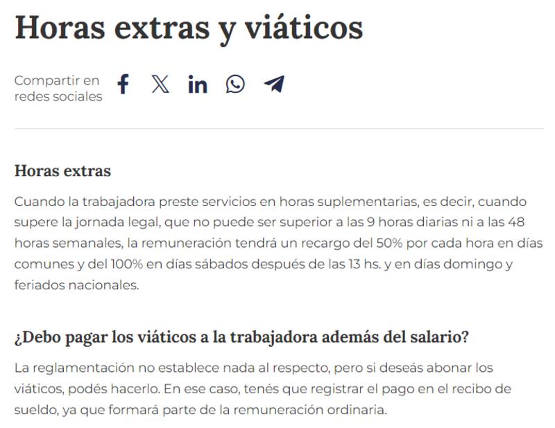 "El empleador deberá abonar al trabajador que prestare servicios en horas suplementarias, medie o no autorización del organismo administrativo competente, un recargo del cincuenta por ciento (50%) calculado sobre el salario habitual, si se tratare de días comunes, y del ciento por ciento (100%) en días sábado después de las trece (13) horas, domingo y feriados", reseña la normativa.