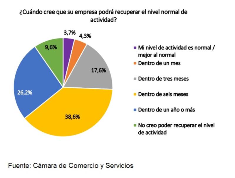 Del cuarto restante, el 3,7% considera que su nivel de actividad actual es normal o incluso mejor al habitual, mientras que el 4,3% espera recuperarse en un mes y el 17,6%, en tres meses.