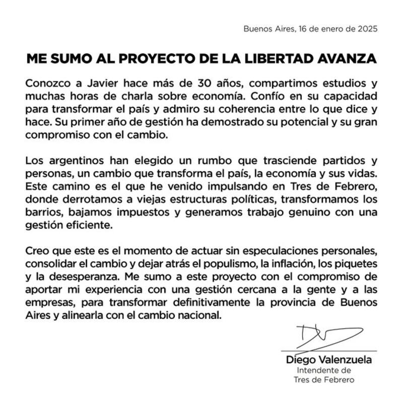 A esa publicación le siguió otra de Valenzuela con una carta en la que explicaba las razones de su pase: "Creo que este es el momento de actuar sin especulaciones personales, consolidar el cambio y dejar atrás el populismo, la inflación, los piquetes y la desesperanza. Me sumo a este proyecto con el compromiso de aportar mi experiencia con una gestión cercana a la gente y a las empresas, para transformar definitivamente la provincia de Buenos Aires y alinearla con el cambio personal".