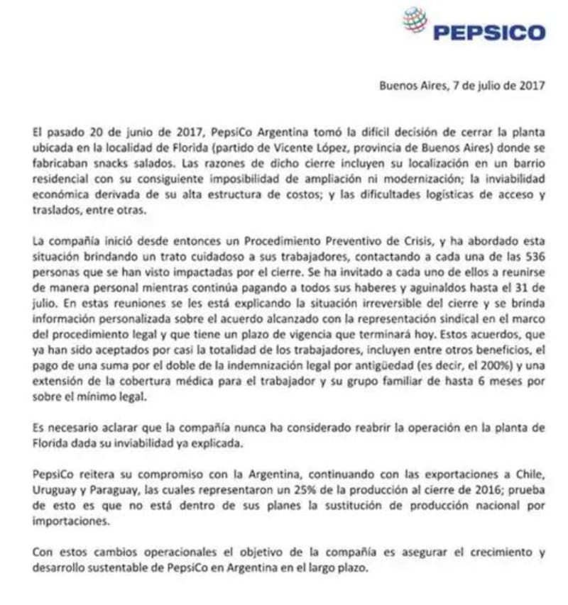 "Pepsico reitera su compromiso con la Argentina, continuando con las exportaciones a Chile,Uruguay y Paraguay, las cuales representaron un 25% de la producción al cierre de 2016", señala el comunicado oficial.
