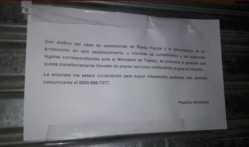 El pasado 20 de junio, la empresa multinacional alimenticia PepsiCo Argentina decidió cerrar la planta ubicada en la localidad de Florida en el partido bonaerense de Vicente López, donde se fabricaban snacks salados.