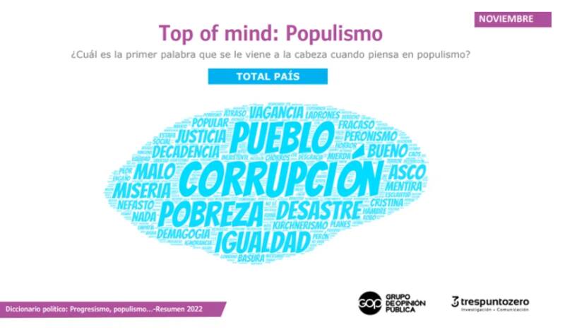 En el total país, la encuesta también consultó sobre el primer pensamiento que se les viene a los participantes al escuchar determinados términos como "populismo". La respuesta principal fue una de las más duras: "corrupción". Entre las siguientes que más aparecieron están "pueblo", "pobreza", "igualdad" y "desastre", un reparto más parejo pero que debela la profundidad de la grieta.