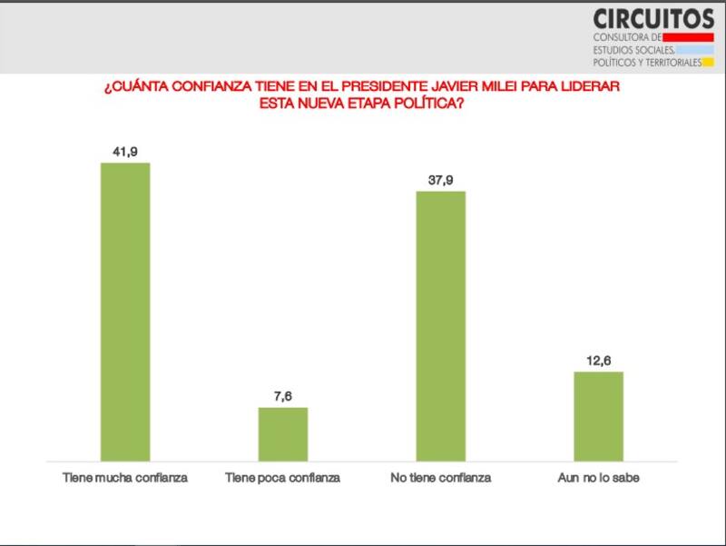 Sobre los desafíos que tiene por delante el Gobierno, se les consultó a los encuestados el grado de confianza que tienen en Javier Milei para "liderar esta nueva etapa política". Un 41,9% tiene mucha, y un 45,5% no tiene o tiene poca confianza, y un 12,6% no sabe.