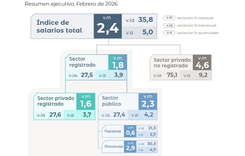 La radiografía fina del informe revela que el verdadero motor del repunte salarial de febrero fue el sector privado no registrado. Los trabajadores informales anotaron un salto mensual del 4,6%, despegándose del resto de los segmentos.