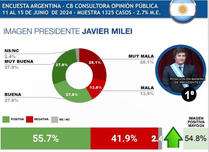 Según los resultados, los tres presidentes sudamericanos más valorados este mes son Javier Mileide Argentina con 55.7% de imagen positiva; en segundo lugar quedó Daniel Noboa, de Ecuador, con 54.3%, y cierra el podio Lula Da Silva de Brasil, con 51.3% de aprobación.