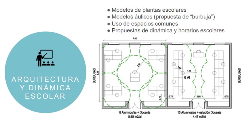 En efecto, la comisión creada para estudiar el regreso a clases incluso avanzó con nuevos esquemas de distribución de pupitres en "burbujas", lo que disminuye considerablemente el espacio y llevaría, según estimaciones, a disponer la presencia de un maestro cada ocho o diez alumnos.