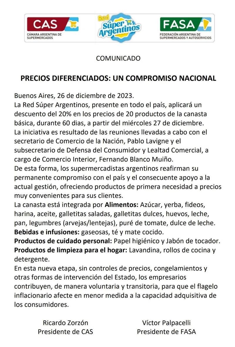 "La Red Súper Argentinos, presente en todo el país, aplicará un descuento del 20% en los precios de 20 productos de la canasta básica, durante 60 días, a partir del miércoles 27 de diciembre", comienza el texto donde se revela cómo funcionará Precios Diferenciados.