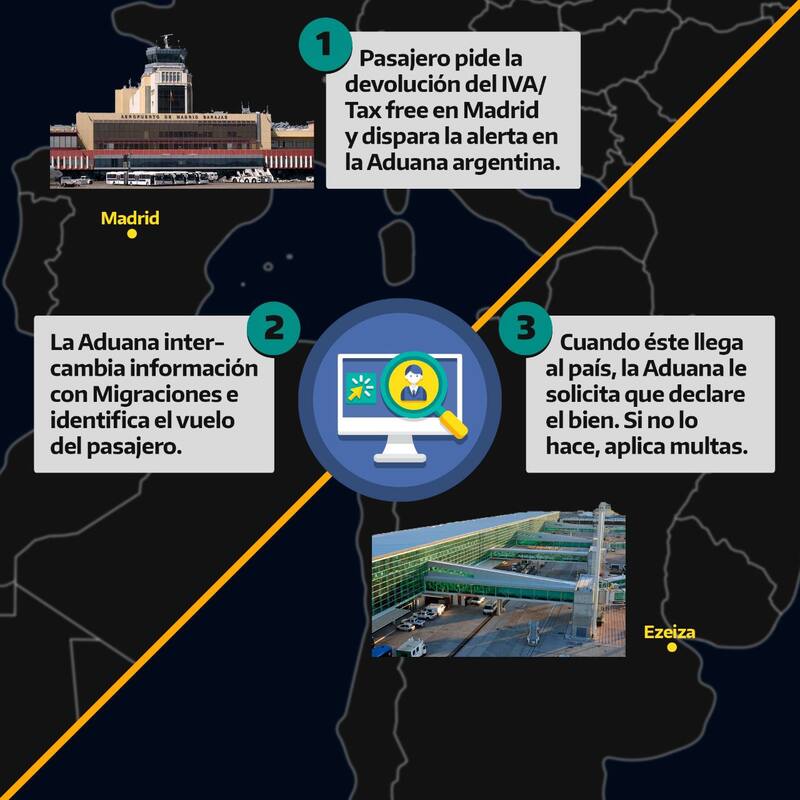 Cuando los turistas argentinos piden la devolución del IVA en aeropuertos ibéricos, de forma sistemática, la Aduana recibe una alerta de información y, con estos datos, le pide a la Dirección de Migraciones identificar el vuelo con los pasajeros en cuestión, que al arribar al país son revisados para identificar si tienen declarados o no los bienes.