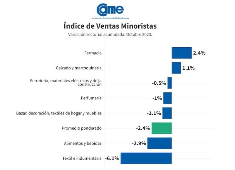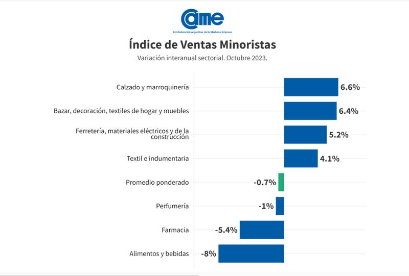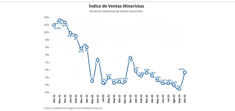 Las ventas minoristas en Argentina registraron un incremento del 4,7% en octubre con respecto al mes anterior, según el último relevamiento realizado por la Confederación Argentina de la Mediana Empresa (CAME). Sin embargo, el informe de la entidad también reveló una caída del 0,7% en las ventas respecto a octubre del año pasado, cuando se mide a precios constantes.