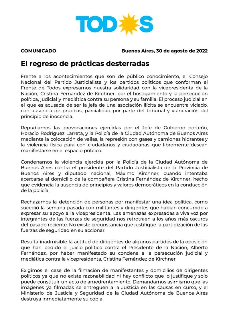 "Condenamos la violencia ejercida por la Policía de la Ciudad Autónoma de Buenos Aires contra el presidente del Partido Justicialista de la Provincia de Buenos Aires y diputado nacional, Máximo Kirchner, cuando intentaba acercarse al domicilio de la compañera Cristina Fernández de Kirchner, hecho que evidencia la ausencia de principios y valores democráticos en la conducción de la policía", agrega el documento.