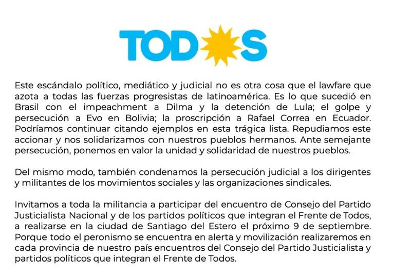 "Porque todo el peronismo se encuentra en alerta y movilización realizaremos en cada provincia de nuestro país encuentros del Consejo del Partido Justicialista y partidos políticos que integran el Frente de Todos", concluye el texto.