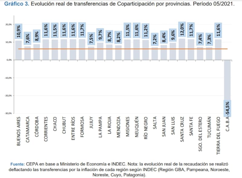 En total, los fondos de coparticipación en mayo crecieron un 6,3% en términos reales en la comparación interanual, a pesar del desplome de 54,5% de los destinados a la Ciudad Autónoma de Buenos Aires (CABA).