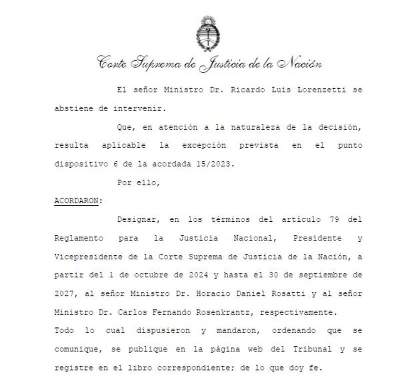 Según la acordada firmada el martes, los ministros designaron "Presidente y Vicepresidente de la Corte Suprema de Justicia de la Nación, a partir del 1 de octubre de 2024 y hasta el 30 de septiembre de 2027, al señor Ministro Dr. Horacio Daniel Rosatti y al señor Ministro Dr. Carlos Fernando Rosenkrantz, respectivamente".