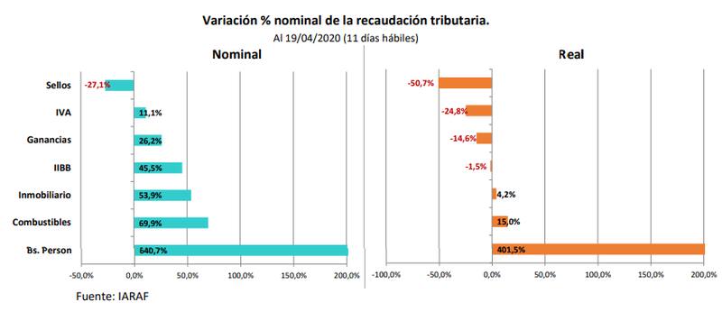 El dato se desprende del monitoreo semanal del Instituto Argentino de Análisis Fiscal (Iaraf), que en los primeros 19 días de abril registra una contracción real de 13% de la recaudación nacional y una baja algo menor, de 6,5%, de lo embolsado por las provincias.