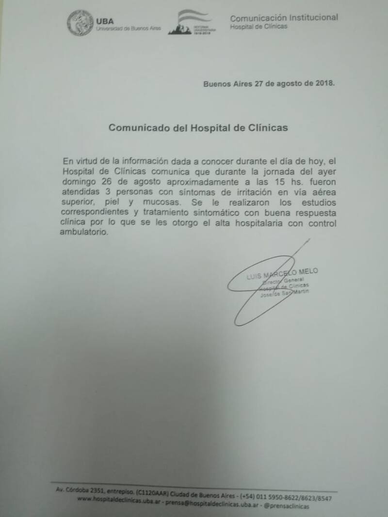 Luego de que Carlos Beraldi, el abogado de Cristina Fernández de Kirchner, sugiriera que durante el allanamiento al domicilio de la ex presidenta en el Calafate intentaron envenenarla, desde el Hospital de Clínicas comunicaron de manera oficial que "durante la jornada del domingo 2 de agosto, aproximadamente a las 15, fueron atendidas 3 personas con síntomas de irritación en vía aérea, superior, piel y mucosas".