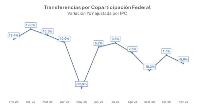 Según un informe al que tuvo acceso este medio, las transferencias automáticas federales mostraron uno de los peores registros de 2025, mostrando una caída del 5% ajustada por inflación, apenas superando las variaciones de septiembre (-10.2%) y mayo (-22.9%).