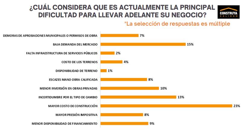 Entre las principales dificultades identificadas se destacó el mayor costo de construcción (23%), la baja demanda del mercado (15%) y la incertidumbre cambiaria (13%). Estas dificultades variaron ligeramente por región y eslabón de la cadena de valor.