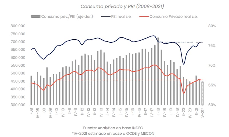 Así lo señala un análisis de la consultoraAnalytica al que accedió en exclusiva El Cronista, que sostiene que la estrategia de basar el crecimiento en el consumo funcionó hasta 2015. En el tercer trimestre del 2021, mientras el PBI volvió a ni veles del segundo del 2019, el consumo privado aún se ubicaba 4 puntos porcentuales por debajo. Y en el cuarto trimestre la situación no se revirtió. Para este año prevén una mejora de un punto contra 2021.