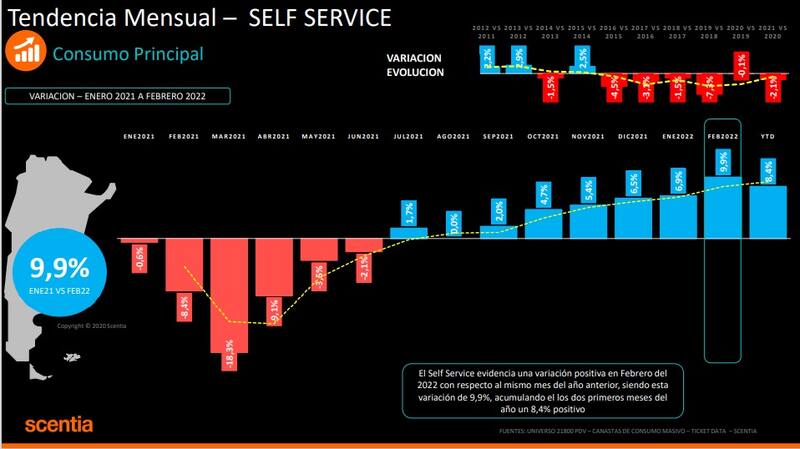 "Continuando con la tendencia positiva que vimos iniciarse en el segundo semestre del 2021 y que continuó en enero de este año, febrero también mostró un comportamiento en alza de 9,9%, respecto a mismo mes del 2021. De esta manera, el acumulado del primer bimestre llega a 8,4%", aseguró Osvaldo Del Río, director de Scentia.
