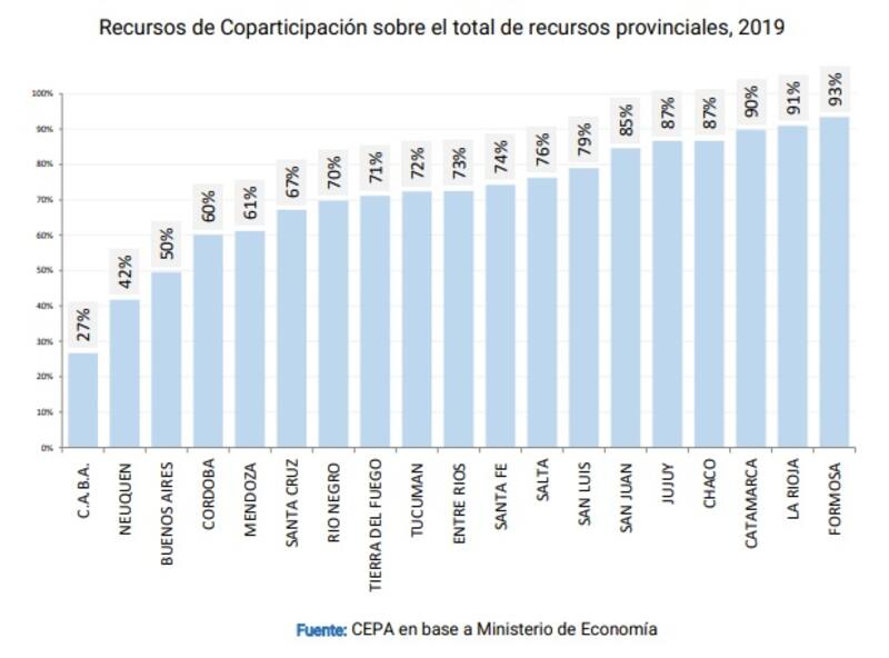En el otro extremo, Formosa recibe el 93% de sus recursos, mientras que en La Rioja es el 91%, en Catamarca representa el 90% y Chaco y Jujuy el 87%.