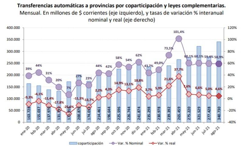 Las transferencias automáticas a provincias por Coparticipación federal de impuestos y leyes especiales alcanzó en agosto los $ 340.730 millones y cerró el mes con una variación interanuales de 58,9%, frente a los $ 214.461 millones del octavo mes de 2020.