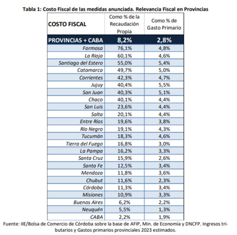 Desde la Bolsa de Comercio de Córdoba indican que el costo fiscal no será afronta en partes iguales entre el Gobierno Nacional y subnacional, aun cuando estos últimas no fueron consultas. "Las provincias y CABA corren con el costo del 58% de las medidas a través de una menor coparticipación, mientras que el 42% restante es aportado por menor recaudación para el nivel nacional", indicaron en el informe.