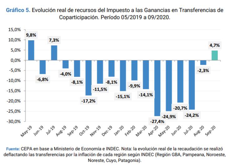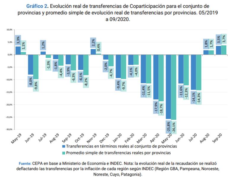Si bien en agosto ya había habido una recomposición contra la inflación de 1,5% esta se había producido por la postergación de los vencimientos anuales de Ganancias y Bienes Personales para personas humanas, que significaron una inyección importante dado que parte de ambos impuestos se reparten entre las jurisdicciones.