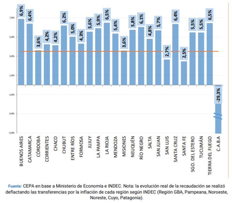 La Ciudad Autónoma de Buenos Aires (CABA) sufrió un deterioro real de 29,3%, debido al recorte de 1 punto porcentual de los 3,5 que recibía de Nación que se entregará a la Provincia, y es el único de los 24 distritos que tuvo una merma respecto al año pasado, aunque Santa Fe y San Luis tuvieron alzas por debajo del promedio, de 2,5% y 2,7% respectivamente.