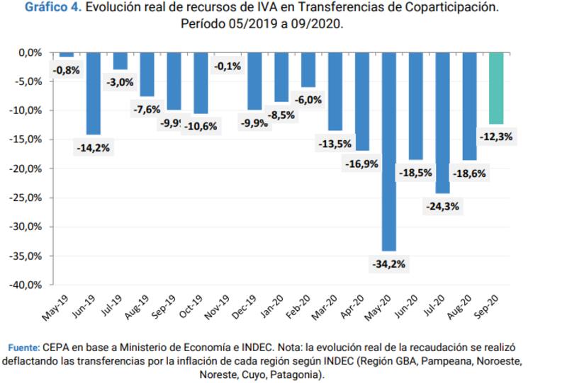 En septiembre, la coparticipación proveniente del IVA cayó 12,3% en términos reales, debido a que la economía sigue deprimida, pero es una baja menor a la que venía experimentando a tal punto que es el mejor registro desde el comienzo de la cuarentena.